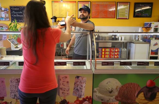 Frozen Art Gourmet Ice Cream & Paletas entrepreneur Jorge Alcázar helping a customer. Photo: Christopher Chung, Press Democrat