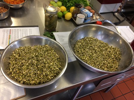 On Sunday (the second day of class), the class met at the Ceres Community Project, a local business with a kitchen accommodating about 15 or more people. The Ceres Project is located in Sebastopol, but also has offices in Santa Rosa and San Rafael. They provide healthy meals for those who are challenged with cancerโ€”including meals for the person’s family too. The meals from Ceres are organic, fresh, sustainable and locally grown–whenever possible. DeAnna and Mary Sheila utilized Ceres’s kitchen to show us hands-on how to make some of the recipes (located in our guidebook) and how this food is beneficial to your health. ๐ŸŽ
